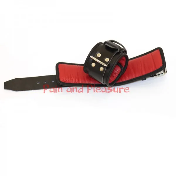 Tato kožená pouta jsou vyrobena z kvalitní pevné hovězí kůže, uvnitř jsou polstrovaná měkkým molitanem a z vnitřní strany je použita příjemná měkká červená kůže, díky níž jsou pouta velice dobře udržovatelná po hygienické stránce, vhodná i pro větší zatížení profesionálních SM salónů či pro profi dominy.